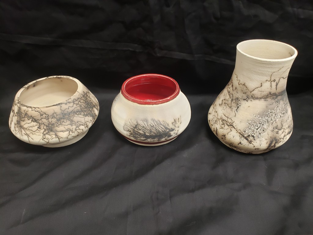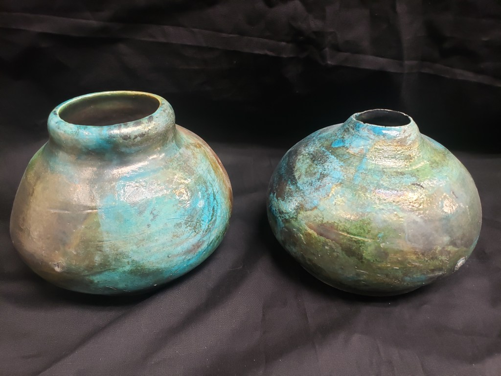 RAKU firing date is June 26th. I know some have been waiting 18 months for this day. The time has come!!! If you throw then come on in and get some pieces made. If not I will have about 30 pieces available for you to buy and glaze the colors you want and then fire. Pieces have to be glazed before firing day. The pics added are from past RAKU days. I will be experimenting with a new firing called Saggar.