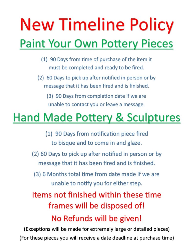 We will be honoring Small Business Saturday. On Saturday anything you buy will be 40% off the studio fee. So the price of the piece will be the regular price and then you will get 40% off of the studio fee. Items will not have to be finished on Saturday but you will have to have them completed in 90 days. Christmas Trees are excluded from this sale. They use way to much glaze.